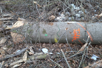 Aktueller Hieb der Bayerischen Staatsforsten im "Hohen Buchenen Wald" - leider fielen nicht nur jede Menge dicker Buchen, sondern auch markierte Biotopbäume. Der Forstbetrieb Ebrach hat ein bemerkenswertes Naturschutzkonzept. Zitat: Um das versehentliche Fällen und Beschädigungen geschützter Lebensstätten zu vermeiden, sind Biotopbäume im Zuge der Hiebsvorbereitung grundsätzlich zu markieren.... (grüne Wellenlinie)