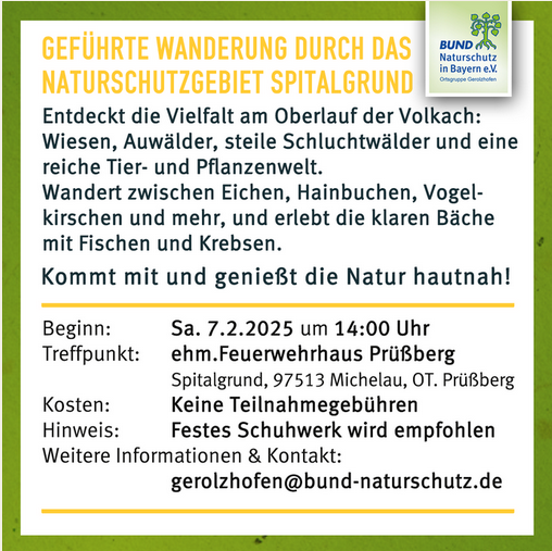 7. Februar (Sa) Geführte „Wanderung im Naturschutzgebiet Spitalgrund“ bei Prüßberg (Gemeinde 97513 Michelau). Treffpunkt ist um 14.00 Uhr am Feuerwehrhaus in Prüßberg im Spitalgrund. Das Gebiet am Oberlauf der Volkach umfasst Wiesen, Auwälder und steile Schluchtwälder. Seine Bäche bieten Platz für reichlich Fische und Krebse. Viele Vögel sind hier heimisch. Unterwegs erläutert Erich Rößner, Landespfleger und Vorsitzender des BN Gerolzhofen, interessante Natur- und Kulturgüter am Wegesrand. Dauer je nach Kondition 2-3 Stunden. Festes Schuhwerk wird empfohlen. Veranstalter ist der BN Schweinfurt. Die Teilnahme ist kostenlos, Sie sind herzlich eingeladen mitzuwandern! Infos: 09382-90 818 oder gerolzhofen@bund-naturschutz.de.